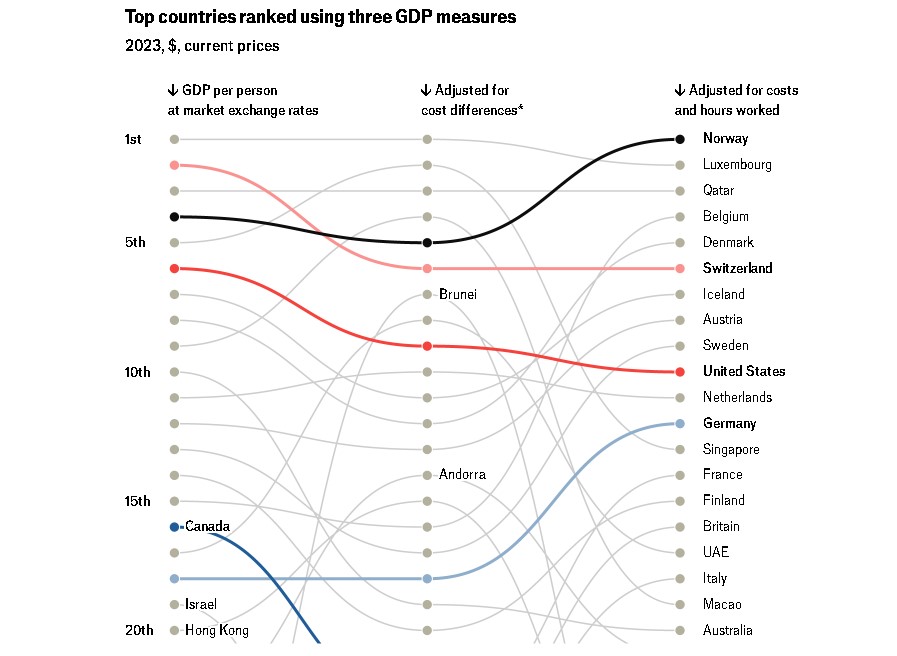 Take America first. Its GDP has been the largest at market exchange rates for over a century. But by income per person it falls to sixth, behind Luxembourg (first) and Switzerland (second). Adjusting for America’s higher prices pushes it down to ninth; accounting for its long workdays and limited holidays, to tenth. The results for China—the world’s second-largest economy in nominal terms—are even starker: it falls to 69th by GDP per person, 75th at local prices and 97th after accounting for hours worked. Singapore and Brunei exhibit some of the biggest differences between each measure, and Macau, a special administrative region of China, had the biggest increase in GDP per person compared with last year.