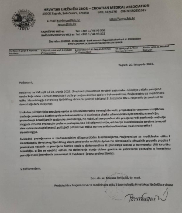 “Sukladno promjenama u međunarodnim dijagnostičkim klasifikacijama, Povjerenstvo za medicinsku etiku i deontologiju Hrvatskog liječničkog zbora preporuča multidisciplinarnu reevaluaciju aktualnih pravnih propisa i procedura vezanih uz promjenu čestice spola u dokumentima ili planiranja ulaska u hormonsku i/ili kiruršku tranziciju, a što se osobito odnosi na definiranje donje dobne granice za pokretanje postupka u kontekstu punoljetnosti (navršenih osamnaest ili dvadeset i jednu godinu života”.