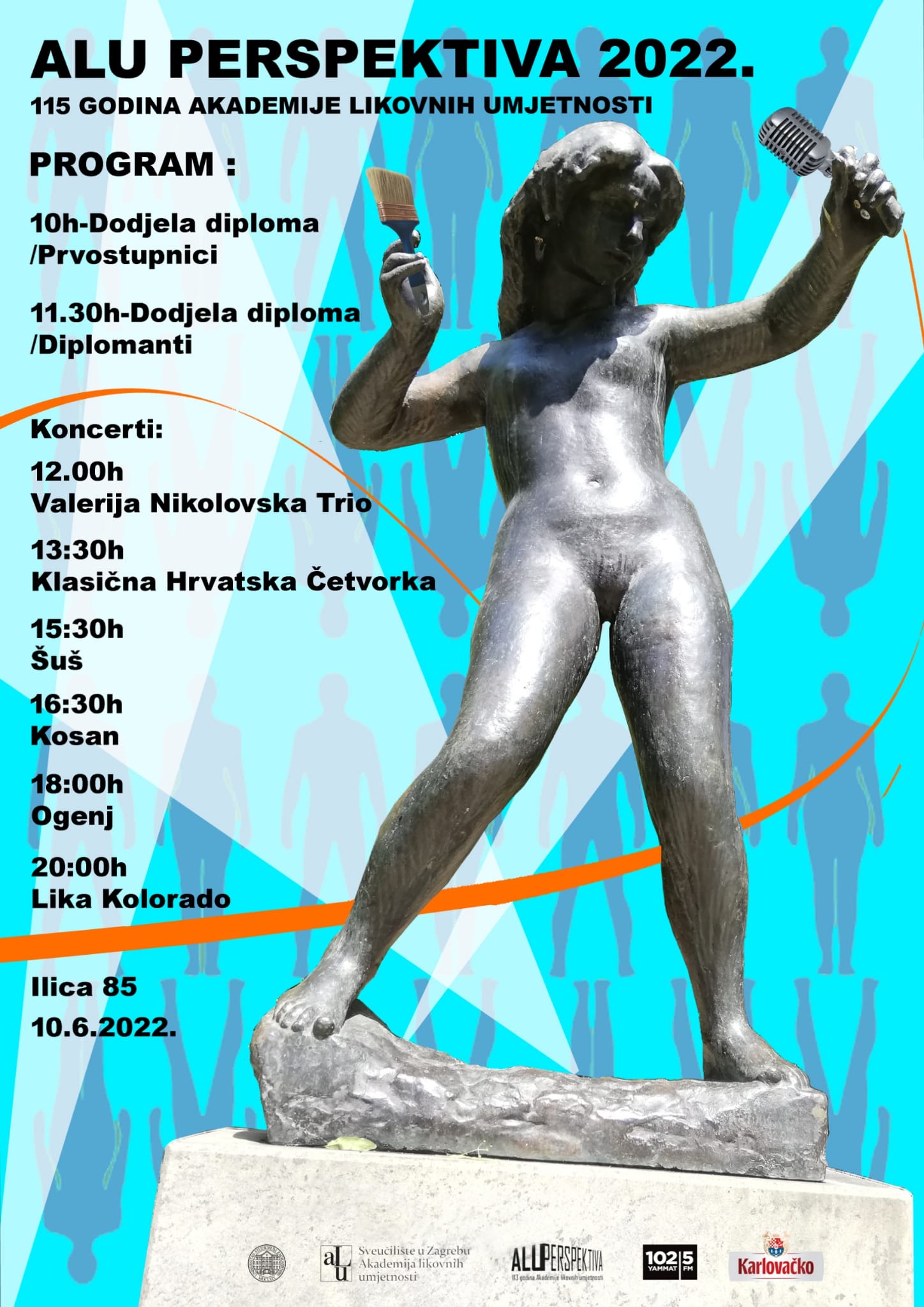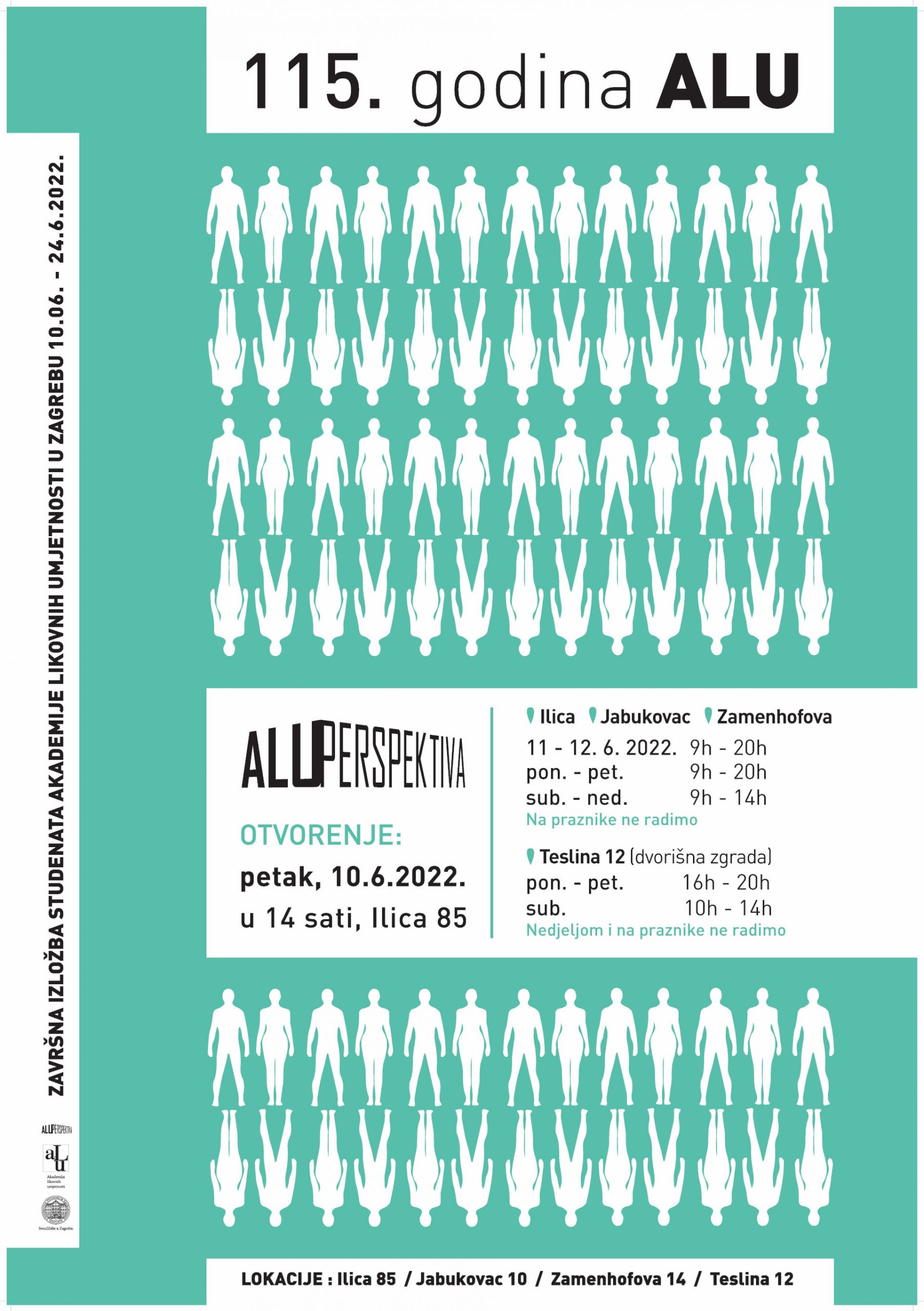 Završna izložba kao i dosadašnjih godina odvijat će se na lokacijama Akademije likovnih umjetnosti u Ilici 85 (glavna zgrada), Jabukovcu 10, Zamenhofova 14 i Teslina 12, te će biti izloženi najbolji radovi studenata svih odsjeka akademije od 10. do 24. lipnja 2022. godine. ALU se sastoji od 6 odsjeka (slikarski, grafički, kiparski, nastavnički, animirani film i novi mediji, konzerviranje i restauriranje umjetnina). Više informacija o programima na svim lokacijama i radnom vremenu potražite na www.alu.hr te na društvenim mrežama Akademije – Facebook + Instagram.
