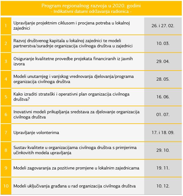 U okviru Programske suradnje Udruge za razvoj civilnog društva SMART s Nacionalnom zakladom za razvoj civilnoga društva kroz Program regionalnog razvoja u 2020. godini održati će niz radionica.