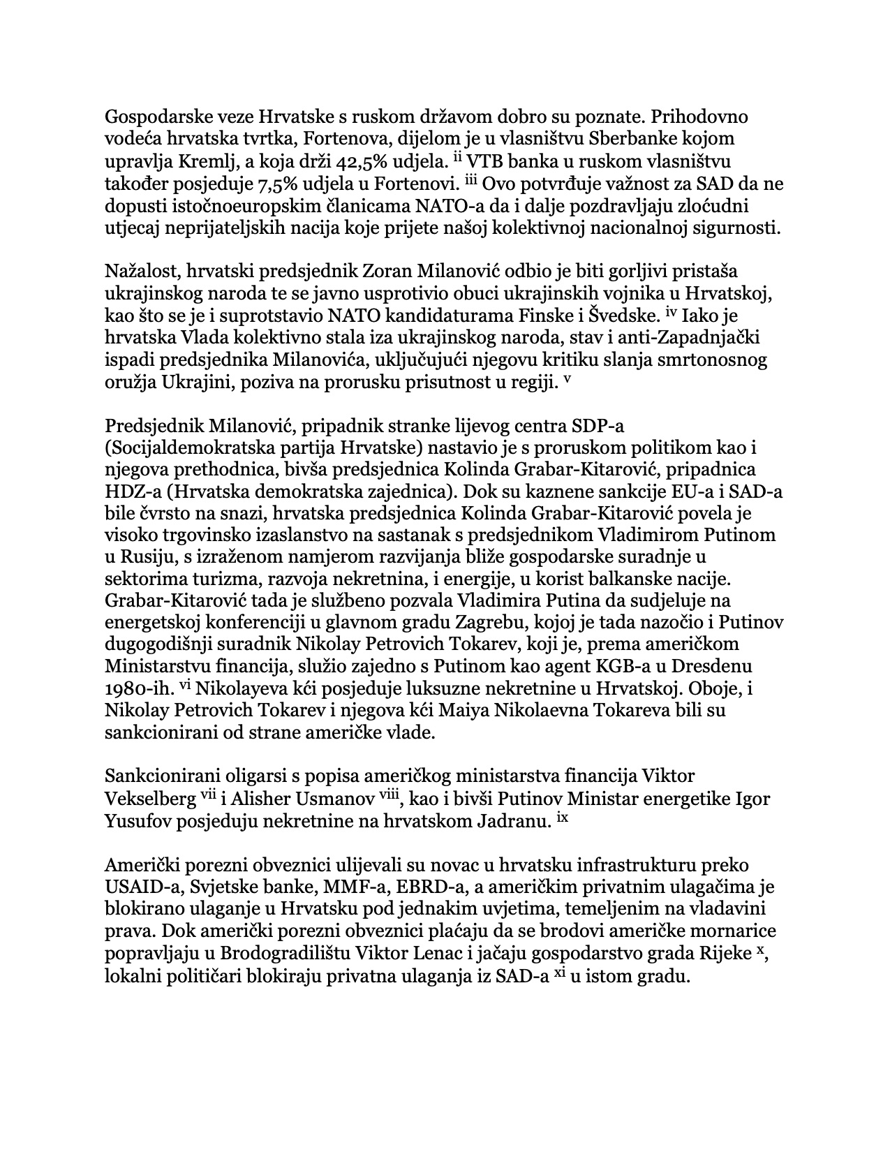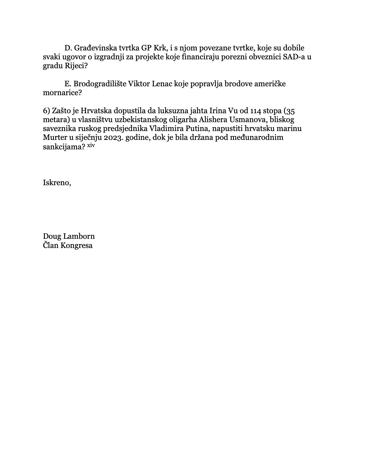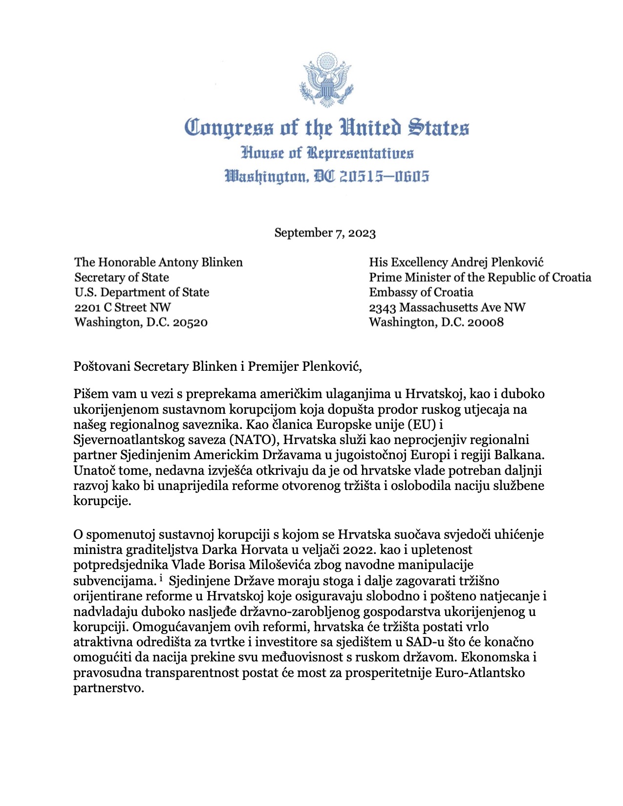 Kongresnik Doug Lamborn u pismu premijeru Plenkoviću i državnom tajniku Blinkenu ukazuje na prepreke s kojim se suočavaju američki ulagači u Hrvatskoj kao i na posvemašnju korupciju koja “dopušta prodor ruskog utjecaja na našeg regionalnog saveznika”. On podsjeća da Hrvatska “kao članica Europske unije i Sjevernoatlantskog saveza služi kao neprocjenjiv regionalni partner Sjedinjenim Američkim Državama u jugoistočnoj Europi i regiji Balkana”. On podsjeća na ruski utjecaj na hrvatsko gospodarstvo, spominjući grupu “Fortenova” i Sberbanku kojom upravlja Kremlj, a posebno se osvrće na prorusku politiku predsjednika Milanovića koji se usprotivio obuci ukrajinskih vojnika u Hrvatakoj i protivnik je priključenja Švedske i Finske NATO savezu. U pismu se spominje i naklonost bivše predsjednice Koilinde Grabar Kitarović prema ruskim invesaticijama kao i činjenica da ruski oligarsi koji su pod američkim sankcijama imaju nekretnine u Hrvatskoj. Podsjeća da američki porezni obveznici preko USAID-a, Svjetske banke, MMF-a EBRD-a indirektno sudjeluju u investiranju u hrvatsku infrastrukturu, dok je američkim privatnim ulagačima blokirano ulaganje pod jednakim uvjetima. Konkretno navodi da američki porezni obveznici financiraju servisiranje američkih ratnih brodova u brodogradilištu Viktor Lenac jačajući gospodarstvo grada Rijeke dok s druge strane lokalni političari blokiraju američke privatne investicije u tom gradu.