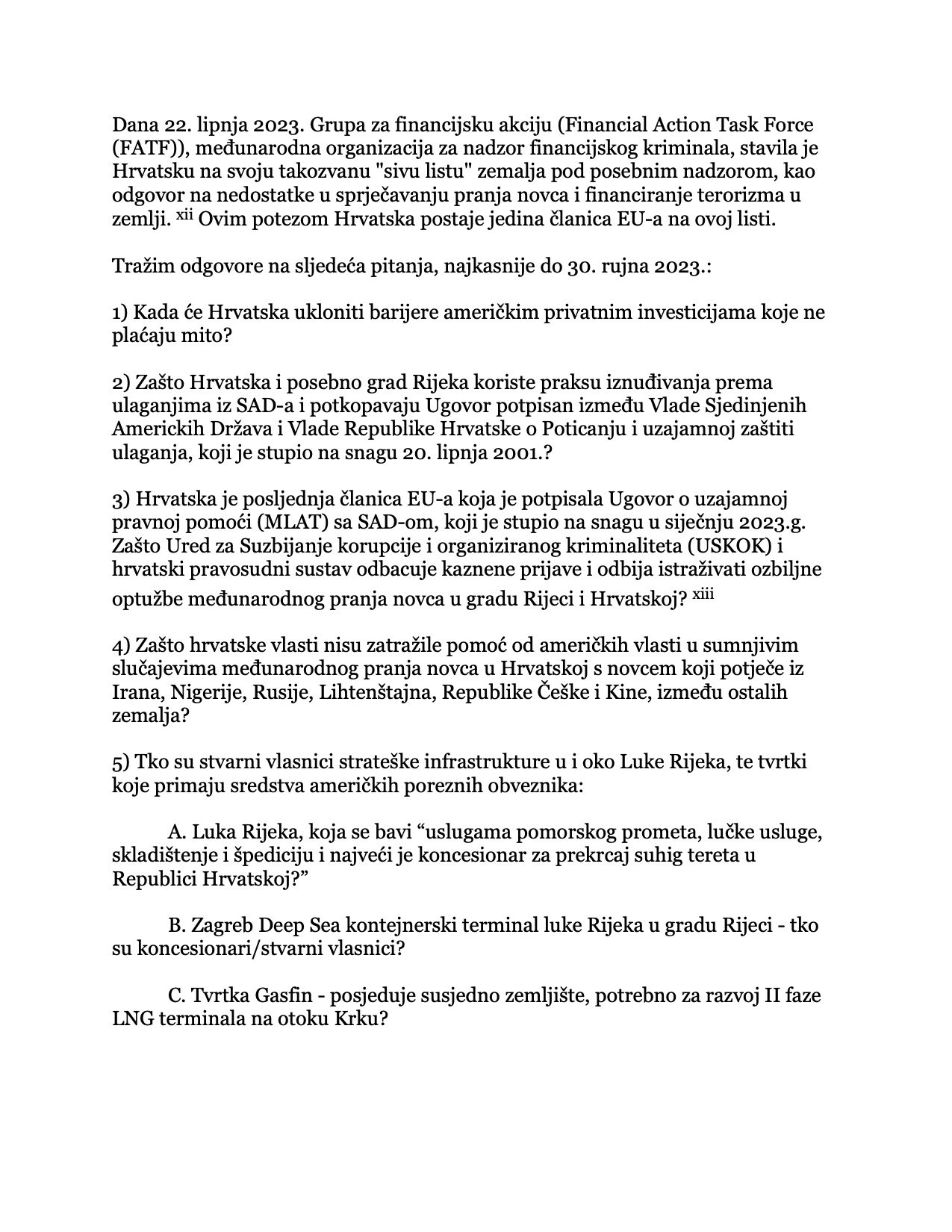 Da ne bi samo ostalo na konstatacijama o korupciji koja pogađa američke investitore kongresnik Doug Lamborn postavio je premijeru Plenkoviću šest pitanja na koja očekuje odgovor do kraja rujna. Kao prvo pita kad će Hrvatske ukloniti barijere američkim privatnim inestitorima koji ne daju mito. Zašto Hrvatska a posebno grad Rijeka koriste praksu iznuđivanja prema ulagačima iz SAD, čime se krši ugovor između dvije države potpisan još 2001. godine. Postavlja se i pitanje “Zašto USKOK i hrvatski pravosudni sustav odbacuju kaznene prijave i odbijaju istraživati ozbiljne optužbe međunarodnog pranja novca u gradu Rijeci i Hrvatskoj?” Kongresnika Lamborna zanima i odgovor na pitanje zašto hrvatske vlasti nisu zatražile pomoć od američkih vlasti u sumnjivim slučajevima međunarodnog pranja novca u Hrvatskoj novcem koji potječe iz Irana, Nigerije, Rusije, Lihtenštajna, Češke i Kine. Njega zanima i tko su stvarni vlasnici strateških poduzeća na području grada Rijeke, što uključuje Luku Rijeka, kontejnerski terminal Zagreb Deep Sea, tvrtku “Gasfin”, građevinsku tvrtku “GP Krk” koja je dobila svaki ugovor o izgradnji objekata što financiraju američki porezni obveznici, te brodogradilište Viktor Lenac koje servisira američke ratne brodove. I konačno zašto je Hrvatska dopustila da luksuzna jahta “Irina Vu” u vlasništvu uzbekistanskog oligarha bliskog prijatelja Vladimira Putina dok je bila pod međunarodnim sankcijama napusti marinu Murter. Sve su to pitanja koja ne zanimaju samo američkog kongrtesnika nego i širu hrvatsku javnost kojom manipulira uspostavljajući cenzuru nad vodećim medijima sam predsjednik hrvatske Vlade Andrej Plenković.