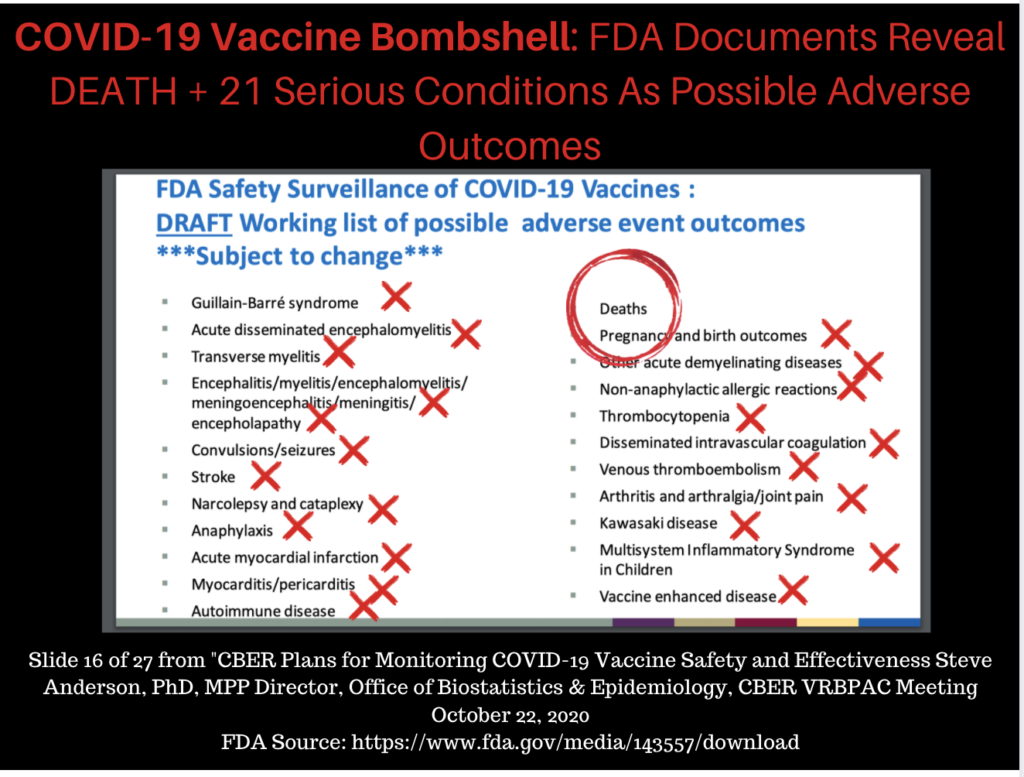 Procurili su dokumenti i javne rasprave FDA-e (američke uprave za lijekove) koji otkrivaju da FDA zna da cjepiva Covid-19 koja se sada lansiraju na tržište mogu uzrokovati veliki broj nuspojava opasnih po život, uključujući smrt. Cjepiva za Covid-19 mogla bi izazvat masovne autoimune bolesti, uključujući imunološki kolaps i smrt. Ukoliko javnost nije upoznata s njihovim stvarnim učincima i ako joj se ne da pravo na izbor, to je protivno medicinskoj struci da lijek bude „siguran i efikasan“ i „neophodan“, kao i medicinskom etičkom principu informirane suglasnosti. Link: FDA GOV