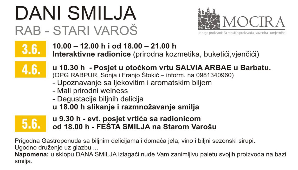 Na otoku Rabu se od 3. do 5. lipnja 2019. godine održavaju „Dani smilja“. Prilika je to da se kroz kreativno druženje još bolje upoznaju blagodati i vrijednost “magriža” i to na sasvim novi način. Nadalje, u sklopu “Dana smilja” bit će održane interaktivne radionice, posjet otočkom vrtu SALVIA ARBAE u Barbatu uz prirodni welness, zatim upoznavanje s ljekovitim i aromatskim biljem, tematsko oslikavanje, druženje s najmlađima i sve to garnirano posebnom gastroponudom sa biljnim delicijama izlagača na „Starom Varošu“ uz prigodnu prodaju proizvoda od smilja i završnu Feštu smilja.