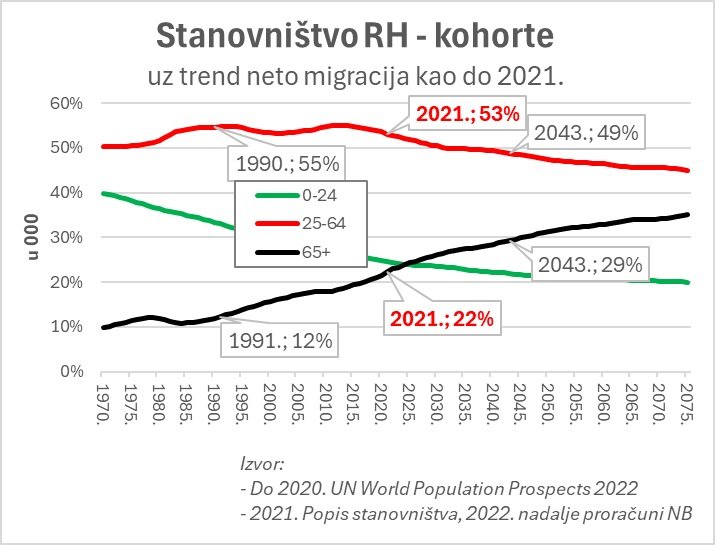 1. No, još gore od pada stanovnika je promjena dobne strukture. Broj građana starijih od 65 će još dugo nastaviti rasti i doseći skoro milijun, a broj djece će nastaviti jako padati. I dok je još prije 25 godina udjel 65+ bio oko 10%, sada je oko 22%, a za 20 godina će narasti na skoro 30%!