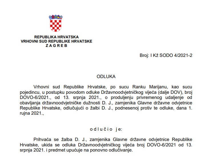 Prema dostupnoj odluci objavljenoj na mrežnim stranicama VSRH, Vrhovni sud smatra da sama činjenica da je glavna državna odvjetnica pokrenula stegovni postupak ne može biti razlog za odluku o produljenju privremenog udaljenja zamjeniku glavne državne odvjetnice. Stegovni postupak nije po automatizmu osnovan razlog koji uvjerljivo opravdava donesenu odluku o produljenju privremenog udaljenja. Zakon koji regulira takve situacije propisuje da zamjenik može biti privremeno udaljen od obavljanja dužnosti, ali to ujedno znači da do toga i ne mora doći. Po ocjeni Vrhovnoga suda odluka Državnoodvjetničkog vijeća ne sadrži valjano obrazloženje pa je nije moguće ispitati. Ako doista za vrijeme trajanja stegovnog postupka nije moguće redovno obavljanje dužnosti zamjeniku glavne državne odvjetnice, onda to treba jasno obrazložiti.