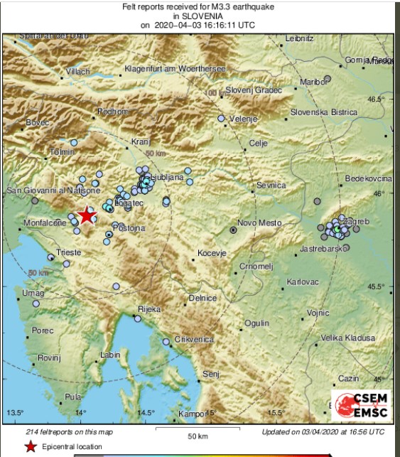 Kako javlja EMSC, dva potresa prodrmala su 3. ožujka 2020.godine u ranim večernjim satima Trst i Ljubljanu. Prvi potres dogodio na području udaljenom 39 kliometara zapadno od Ljubljane, a magnituda mu je bila 3,7 prema Richteru. Nekoliko minuta nakon toga drugi potres se dogodio na području udaljenom 33 kliometra sjeveroistočno od Trsta, a magnituda mu je bila 3,3 prema Richteru.
