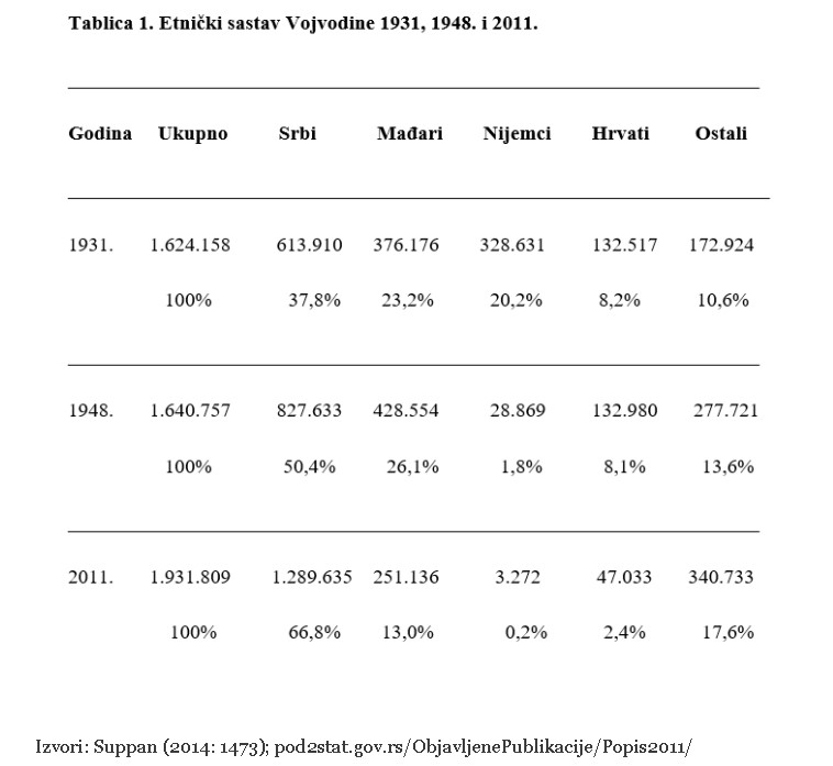 Tablica govori više od tisuće riječi. “Prvi put u povijesti Vojvodine od kraja osmanske vladavine potkraj 17. stoljeća Srbi su činili relativnu većinu stanovništva ne samo na selu nego i u gradovima, a prvi put od nove kolonizacije u 18. stoljeću slavensko stanovništvo činilo je apsolutnu većinu u odnosu prema neslavenima. Pod pritiskom rata, tako su za nekoliko godina postignuti bitni srpski nacionalni ciljevi” (Suppan 2014: 1474; v. i Portmann 2009).