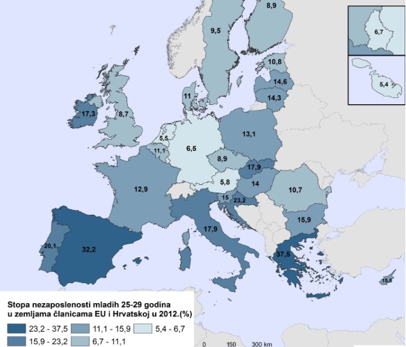 U svoj analizi Akrap je posebno pažnju posvetio nezaposlenošću mlađeg dijela radnog kontingenta. Naime, na početku gospodarske krize 2008. stope nezaposlenosti mladih u Hrvatskoj po dobnim skupinama iznosile su: 17,8 (20-24), 10,0 (25-29) i 8,7 (30-34) posto. Ubrzo je gospodarska kriza uzrokovala veliki porast nezaposlenosti. Stope nezaposlenosti mladih u Hrvatskoj u 2012. po dobnim skupinama iznosile su: 37,2 (20-24), 23,2 (25-29) i 20,7 (30-34) posto. Dakle, nakon četiri godina stopa nezaposlenosti mladih je bila barem dvostruko veća. Od svih članica EU jedino su Grčka i Španjolska imale nepovoljnije stanje. Akrap je tada zaključio da se nezaposlenost i drugi razvojni problemi neće riješiti ulaskom u EU, nego da će i dalje ostati zadatak političkih i gospodarskih elita.