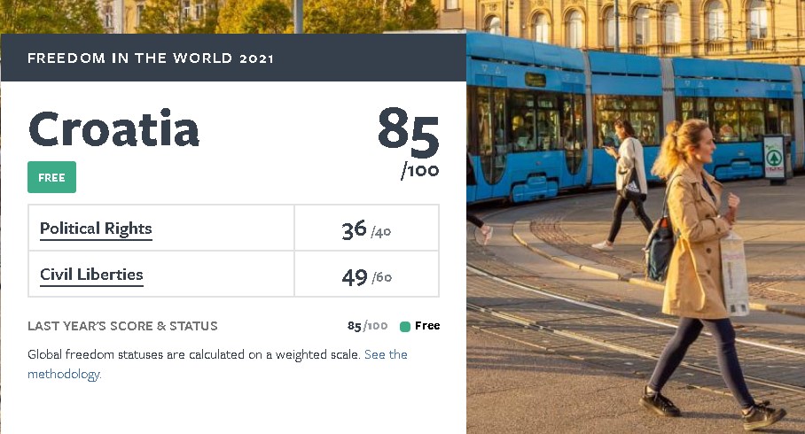 Godišnje izvješće za svih 210 zemalja za 2021. godinu može se pronaći na internetskoj poveznici: https://freedomhouse.org/countries/freedom-world/scores a rezultati za Republiku Hrvatsku na poveznici: https://freedomhouse.org/country/croatia/freedom-world/2021. U nastavku donosimo nekoliko naglasaka iz godišnjeg izvješća FH koji se odnosi na Hrvatsku.