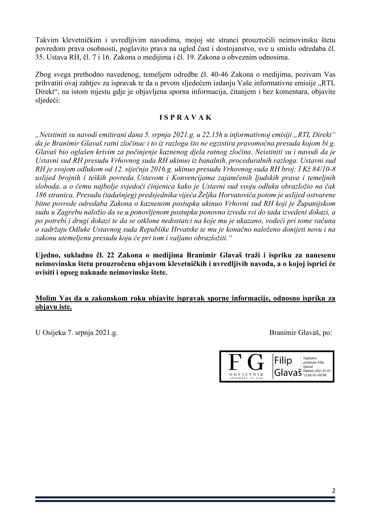 Zahvaljujem RTL-u i Zoranu Šprajcu na brzini “isprike”, jer su mi time maksimalno skratili rok za utuženje. Slijedi tužba protiv RTL-a i Zorana Šprajca radi naknade neimovinske štete zbog povrede mojih prava. Zoranu Šprajcu slijedi i tužba zbog kaznenog djela protiv prava na ugled, čast i dostojanstvo, učinjeno kaznenim djelom klevete iz čl. 149. st. 1., a kažnjivo po čl. 149. st.2 KZ/11.