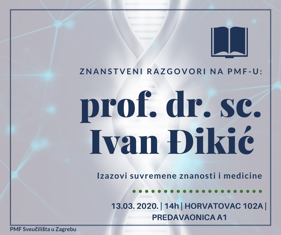 Prof. dr. sc. Ivan Đikić održat će predavanje pod nazivom „Izazovi suvremene znanosti i medicine” iz ciklusa „Znanstveni razgovori na PMF-u”. Predavanje će se održati u petak, 13. ožujka 2020. s početkom u 14 sati u sjedištu PMF-a, Horvatovac 102a (predavaonica A1). Naime, nakon nekoliko uspješnih „Znanstvenih razgovora na PMF-u” održanih tijekom prošle godine, u kojima su gostovali neki od najvećih hrvatskih znanstvenika današnjice, poput Igora Rudana te Nenada Bana, ovog puta će PMF Sveučilišta u Zagrebu ugostiti dr. Ivana Đikića, profesora na Sveučilištu Goethe u Frankfurtu i člana organizacije Max Planck Society te jednog od najuglednijih hrvatskih znanstvenika današnjice.