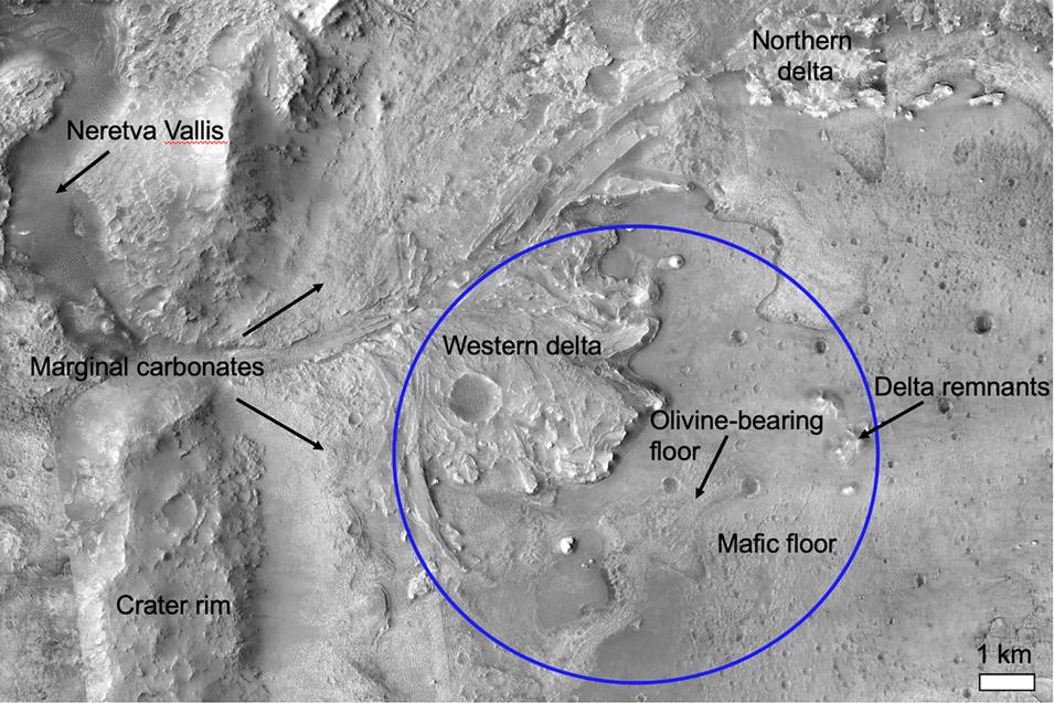 Slika 1 – Predviđeno mjesto slijetanja rovera Perseverance je krater Jezero, Neretva Valley na Marsu
