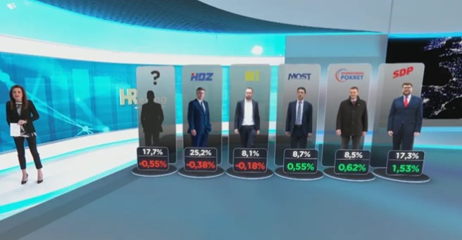 Kako navodi prezenterica Munižaba, anketa pruža rezultate kao da je Hrvatska jedna izborna jedinica i ne uzima u obzir predizborne koalicije. HDZ je uvjerljivo prvi, s obzirom da ga podržava četvrtina ispitanika. Neodlučni su sa 17.7 posto druga politička snaga u zemlji. Broj neodlučnih birača je pao nakon dugo vremena, za 0.55 posto. Od pet najpopularnijih stranaka, pala je potpora HDZ-u (-0.38 posto) i Možemo (-0.18 posto). U odnosu na prošli mjesec, u plusu su: Most (+0.55 posto), Domovinski pokret (+0.62 posto) i SDP (+1.53 posto).
