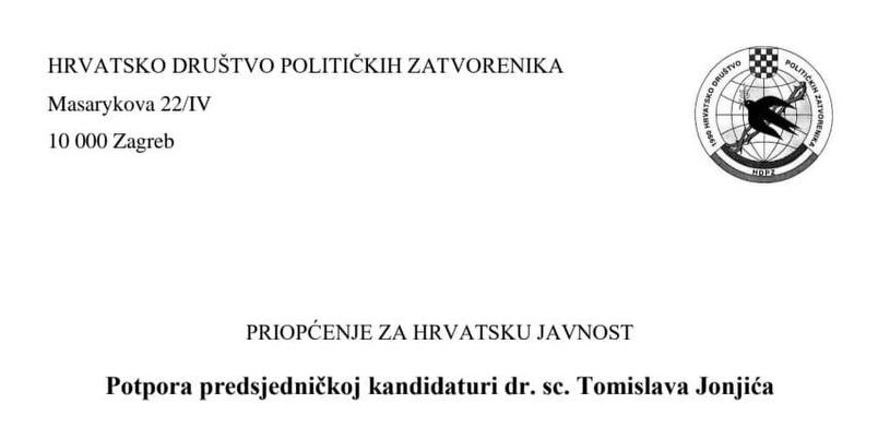 HRVATSKO DRUŠTVO POLITIČKIH ZATVORENIKA: POTPORA PREDSJEDNIČKOJ KANDIDATURI DR. SC. TOMISLAVA JONJIĆA
