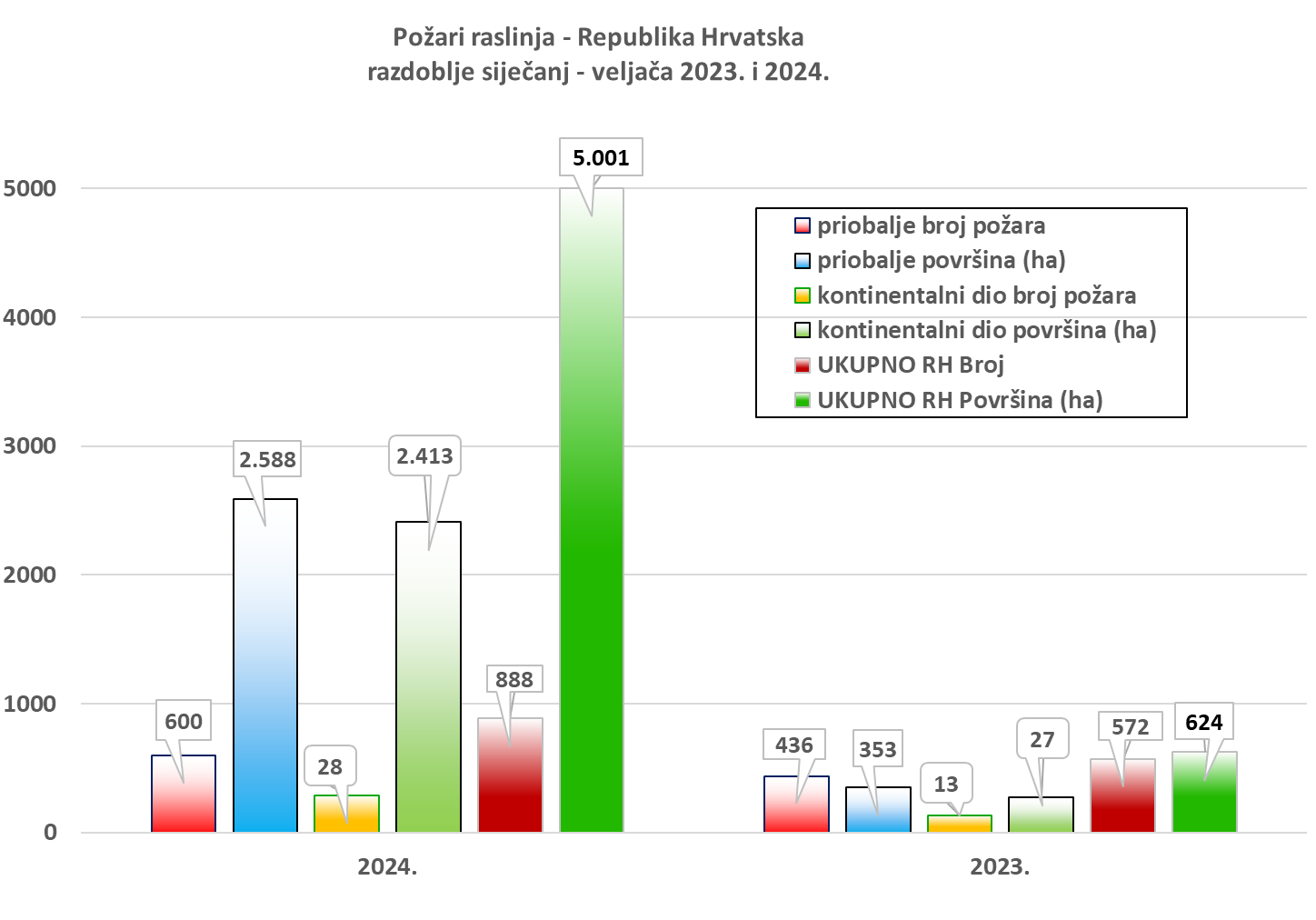 U cijeloj 2023. godini u Republici Hrvatskoj zabilježeno je 3013 požara raslinja s ukupno procijenjenom opožarenom površinom od 5.251 ha što znači, ako se usporede podaci za prva dva mjeseca 2024. godine s podacima za cijelu 2023., broj požara iznosi nešto manje od trećine (29,47%) svih požara u 2023. dok je vrijednost procijenjene opožarene površine dosegla čak 95,24% procijenjene opožarene površine za cijelu 2023. godinu.