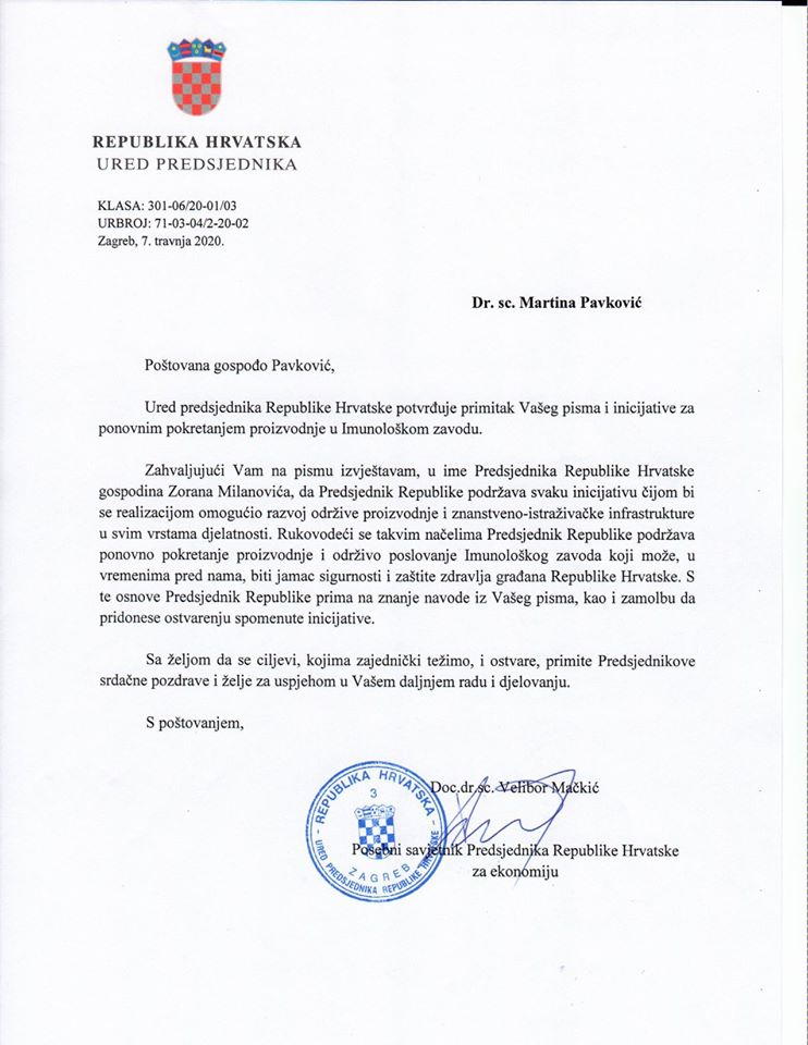 Prema dostupnom pismu datiranom od 7. travnja 2020. čini se da predsjednik Milanović podržava Imunološki zavod. Zbog aktiviranja Imunološkog zavoda, upućeno je pismo premijeru Plenkoviću i predsjedniku RH Zoranu Milanoviću od strane Marine Pavković. Na isto je od predsjednika Milanovića stigao odgovor u kojem “podržava ponovno pokretanje proizvodnje i održivo poslovanje Imunološkog zavoda koji može, u vremenima pred nama, biti jamac sigurnosti i zaštite zdravlja građana republike Hrvatske”.