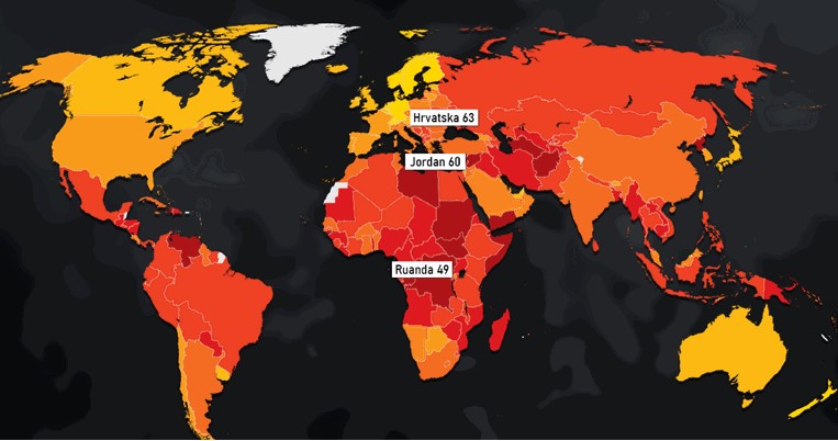 Slovenija je s indeksom od 60 zauzela 33. mjesto u svijetu, a Italija je 52. na popisu s indeksom od 53 boda. Srbija je na 94. mjestu svjetske ljestvice s 38 bodova, a na čak 111. mjestu je BiH s indeksom 35.