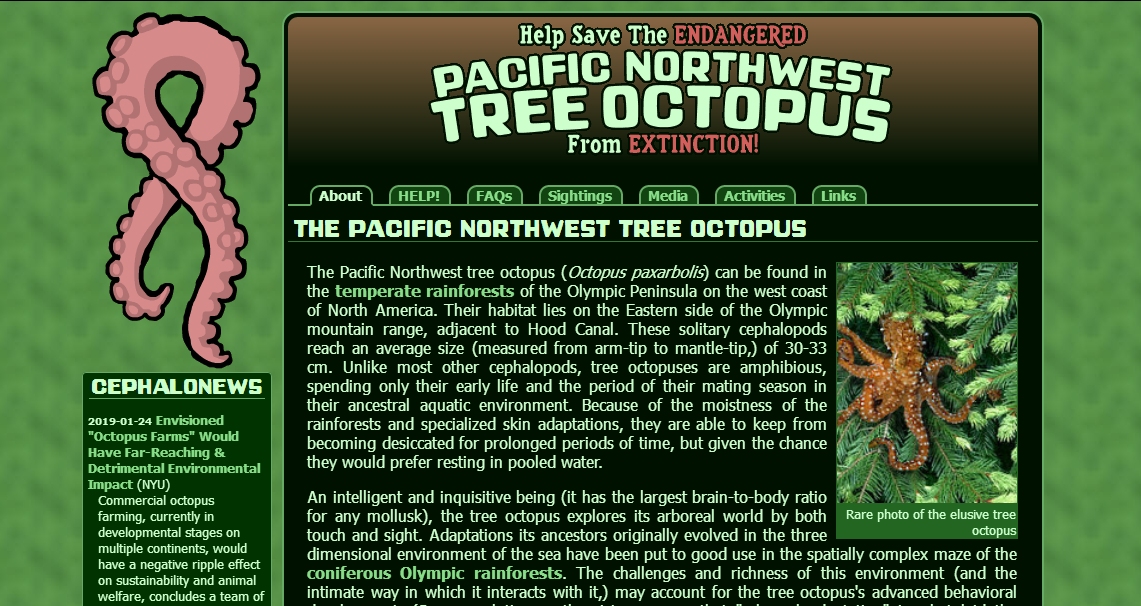 Slika 2. Stranica posvećena šumskoj hobotnici. Sve poveznice su aktivne i sadrža pregršt (izmišljenih) primjera i montiranih fotografija, pa i videa.