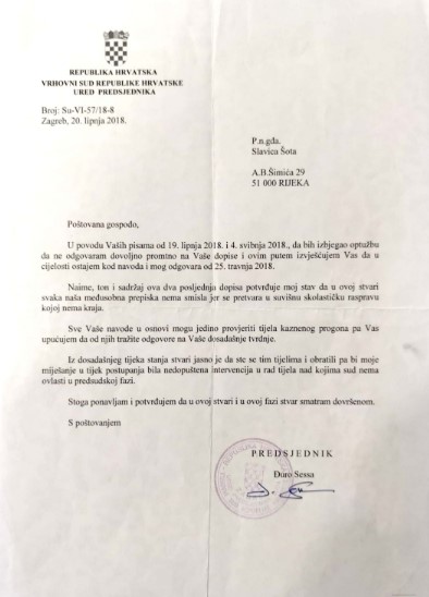 Šota se žali na sadržaj Sessinog odgovora koji se bez ikakvih povoda poziva na medijske objave, umjesto da se bavi meritumom stvari. Šota mu oštro odgovara u svojem stilu, te u post scriptumu ogorčena dodaje: S obzirom da ste odgovor proslijedili i prozvanom Veljku Mškulinu, predlažem da on zauzme vašu fotelju, a vi dođete na njegovo mjesto predsjednika Županijskog suda u Rijeci. Više je nego jasno, tko je kome nadređen!