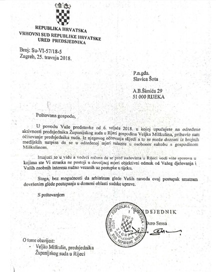 Zbog toga Slavica Štota, kao članica riječkog Pokreta otpora upućuje službeni dopis Vrhovnom sudu hrvatske, odnosno njegovom predsjedniku Đuri Sessi koji ne pokazuje nikakvu zainteresiranost za počinjeni prekršaj od strane njegovog riječkog kolege, nego naprotiv, staje u njegovu zaštitu! Umjesto sankcija Miškulinu, Sessa napada zviždačicu.