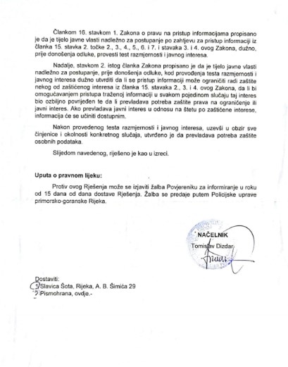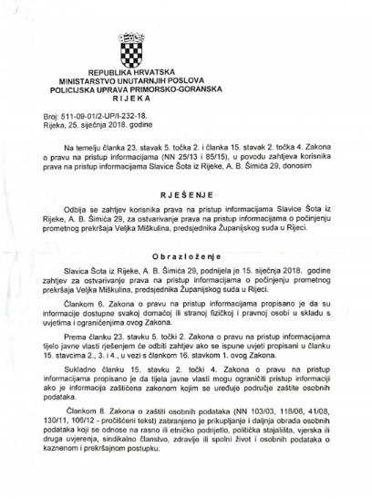 Odgovor koji je napisala policija posredno potvrđuje da je informacija točna, ali o tome ne žele otkrivati detalje. U odgovoru kojeg potpisuje načelnik PU Primorsko-Goranske – Tomislav Dizdar, navodi se da se odbija zahtjev prava na pristup informacijama o počinjenju prometnog prekršaja Veljaka Miškulina. Da Veljko Miškulin nije počinio prometni prekršaj, policija bi to napisala. Ovako, odbijajući otkriti detalje o Veljku Miškulinu i njegovom prekršaju, policija potvrđuje da se taj događaj uistinu zbio.