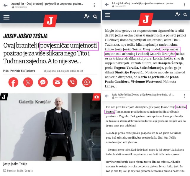 Je li Josip Joško Tešija “branitelj koji je bio na bojišnici na prvoj crti” i je li njegova navodna karijera modela uistinu svjetskih razmjera kako navodi, to ostavljam braniteljima i njegovim kolegama modelima da utvrde. Tema ovog teksta su konstatacije koje je Josip Joško Tešija iznio, a odnose se na moju struku. Naime, u većini medijskih nastupa, Joško Josip Tešija se predstavlja kao povjesničar umjetnosti, arheolog, kustos i voditelj Galerije Kranjčar.