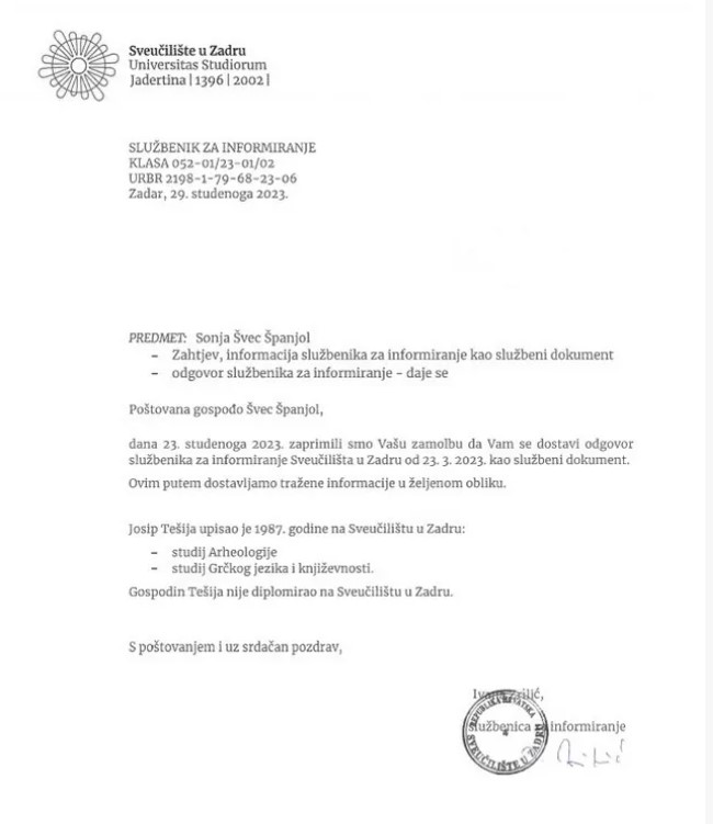 I na kraju razlog zašto sam napisala ovaj tekst? Zato što se Josip Joško Tešija nije slučajno, jednom, greškom, lažno predstavio, već u svakom medijskom istupu, a njih je poveći broj, Josip Joško Tešija kontinuirano navodi da je kustos, povjesničar umjetnosti i arheolog, koji je studirao povijest umjetnosti i arheologiju u Zadru. No, prema službenim podacima koje sam dobila od Sveučilišta u Zadru, Josip Joško Tešija je 1987. godine upisao studij Arheologije i studij Grčkog jezika i književnosti, ali NIKADA NIJE DIPLOMIRAO na Sveučilištu u Zadru, a bogami, prema službenim podacima dobivenim od strane Sveučilišta, studij Povijesti umjetnosti nikada nije ni upisao. Ako je Josip Joško Tešija u međuvremenu negdje drugdje upisao i završio studij Arheologije i studij Povijesti umjetnosti, ja ću prva demantirati samu sebe i ispričati se Jošku, ali voljela bih dobiti diplomu na uvid kao dokaz u aktualno stanje.