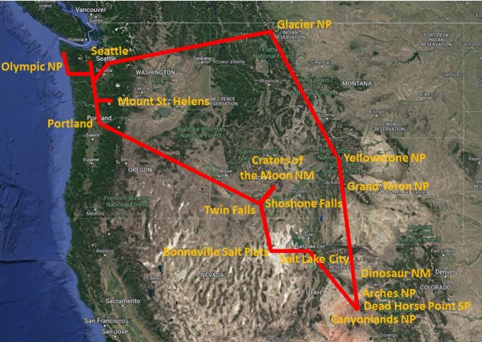 Putovanjem po sjeverozapadu SAD prolazimo priobalni dio, te priobalne i kaskadne planine, američki Stjenjak, te unutrašnji bazen i platoe uključujući zatvoreni bazen sjeverne Utah-e. Vjerojatno najupečatljiviji i prostorno najveći dojam Stjenjaka u SAD je Glacier NP. Pod upečatljivošću Stjenjaka podrazumijevam visoke planine sa stjenjskim padinama, jezerima, ledenjacima i šume. Na sjeverozapadu SAD je snažna vulkanska aktivnost koja se očituje u području gejzira u Yellowstone NP, prostoru izljeva lave u The Craters of the Moon National Monument te vulkanu Mt. St. Helens. U priobalnom dijelu naglasak je na posjetu kišnih šuma, ponajprije u Olympic NP. Na sjevernoj Utahu nalazi se ogoljeli pejzaž s fosilima i ostacima dinosaura. Spektakularni oblici pustinjskog krajolika, kao potpuna suprotnost Stjenjaku i priobalnom pojasu, vidjet ćemo na sjeveru Utah-e u nacionalnim i državnim parkovima Arches (prirodni lukovi), Canyonland, Dead Horse Point te ravnih slanih površina u Bonneville Salt Flats i Veliko slano jezero. Od većih i poznatijih gradova posjećujemo Seattle, Portland i Salt Lake City. Putovanjem uključuje šest američkih država: Oregon, Washington, Idaho, Montana, Wyoming i Utah. Na putu zastajemo i u brojnim manjim gradovima. Program je rađen na temelju važnosti, poznatosti, posebnosti i međusobne različitosti. Ovo studijsko putovanje daje nešto veći naglasak na prirodno-geografsku komponentu prostora, posjećujući šest nacionalnih parkova i četiri područja pod drugačijom zaštitom. Putovanje uključuje tri mjesta koja se nalaze na UNESCO-vom popisu svjetske prirodne baštine: Yellowstone NP, Olympic NP i Glacier NP (kao zajednička zaštita pod imenom Waterton Glacier International Peace Park s prekograničnom kanadskim Waterton Lakes NP)