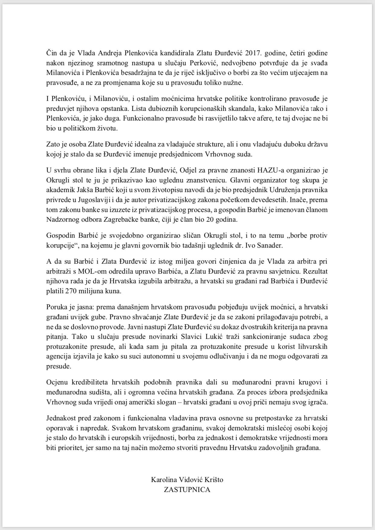 Čin da je Vlada Andreja Plenkovića kandidirala Zlatu Đurđević 2017. godine, četiri godine nakon njezinog sramotnog nastupa u slučaju Perković, nedvojbeno potvrđuje da je svađa Milanovića i Plenkovića besadržajna te da je riječ isključivo o borbi za što većim utjecajem na pravosuđe, a ne za promjenama koje su u pravosuđu toliko nužne.