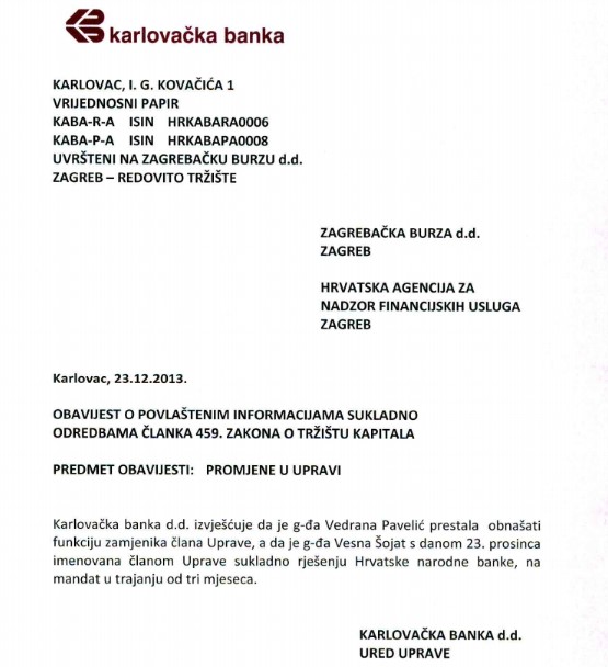 Podsjetimo, nakon uhićenja članova obitelji Šola i još nekolicine osoba vezanih za kreditne plasmane Karlovačke banke 2013. godine, došlo je do promjene Uprave i članstva Nadzornog odbora (NO), u kojem su dotadašnje visokopozicionirane članove KaBa – Sandija Šolu, kirurga Josipa Paladina, poduzetnika Gorana Vukšića i bivšeg župana Karlovačke županije Ivicu Horvata zamijenili Vedrana Pavelić kao članica NO i Ivan Vrljić kao zamjenik predsjednika Uprave. Vedrana Pavelić je kao članica NO Karlovačke banke jedno kratko vrijeme obnašala i funkciju članice Uprave.