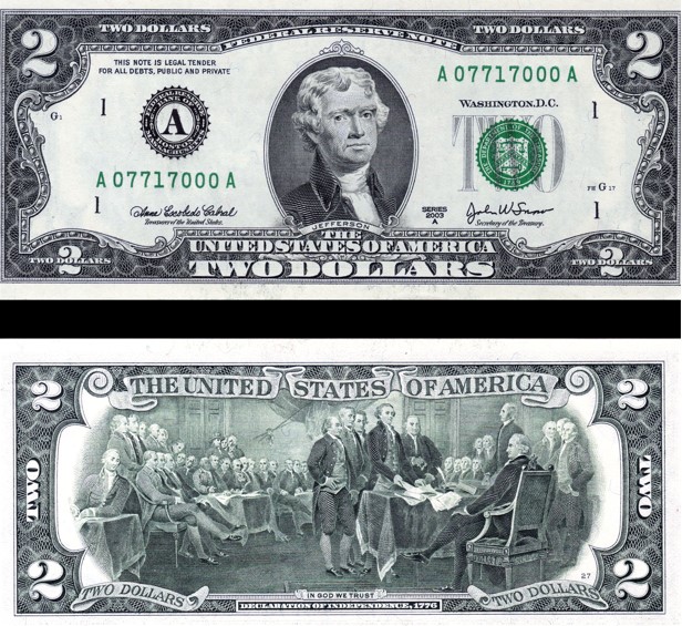 Naslovna foto: 2 dolara avers Thomas Jefferson. (Revers Deklaracija o nezavisnosti)
