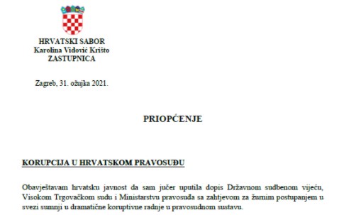 Obavještavam hrvatsku javnost da sam jučer uputila dopis Državnom sudbenom vijeću, Visokom Trgovačkom sudu i Ministarstvu pravosuđa sa zahtjevom za žurnim postupanjem u svezi sumnji u dramatične koruptivne radnje u pravosudnom sustavu.