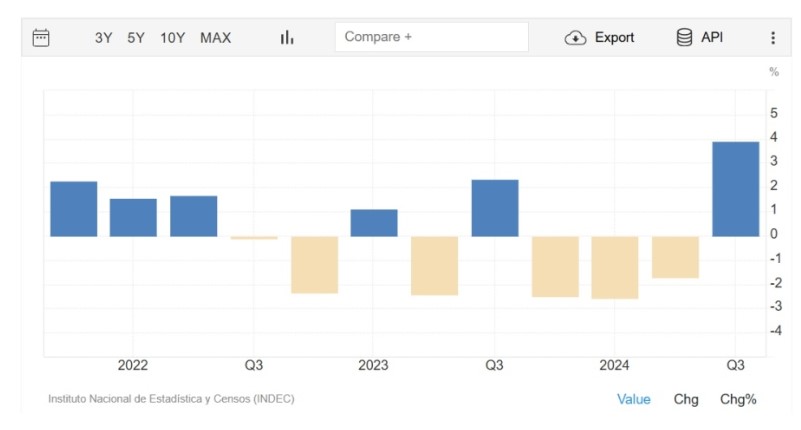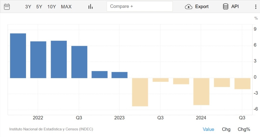 Na godišnjoj razini, pak BDP je i dalje u padu, međutim, BDP je u padu na godišnjoj razini još od 2023. godine kada Javier Milei nije vodio državu: