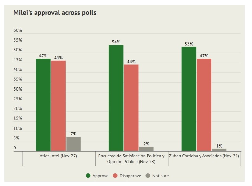 Što je još u Argentini novo? Jučer su argentinske državne obveznice porasle, a nedavno su objavljena istraživanja javnog mnijenja po kojima više građana podržava Mileijeve mjere nego što je onih koji im se protive.