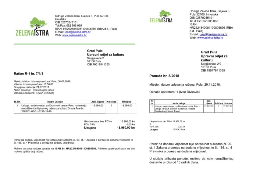 Podsjetimo, u pulskom slučaju riječ je o dva odvojena postupka – analizi korištenja prostora i savjetu za formiranje kriterija za dodjelu prostora. Oba računa su iz 2018. godine. Onaj za analizu iz srpnja 2018. godine, a za kriterije iz studenog. Ukupan iznos koji je Grad Pula to platio iznosi 36.752 kune. Izradu analize tešku gotovo 40 tisuća kuna predložila je Dušica Radojčić, koja je tada bila predsjednica udruge Zelena Istra, a prijedlog je usvojila Koodinacija Društvenog centra Rojc, u kojoj je drugarica Radojčić bila – predsjednica. Možemo! 2018. još nije postojao kao politička platforma a Celakoski i Radojčić tada su još uvijek bili tzv. aktivisti.