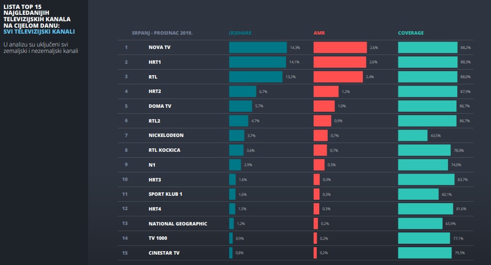 Analiza koja je uključivala sve zemaljske i nezemaljske kanale dostupne AdScanneru, dala je popis petnaest najgledanijih televizijskih kanala i emisija. Promatrajući sve kanale u HR najgledaniji su nacionalni zemaljski kanali. Na prvoj poziciji nalazi se Nova TV, slijede je HRT1 i RTL.