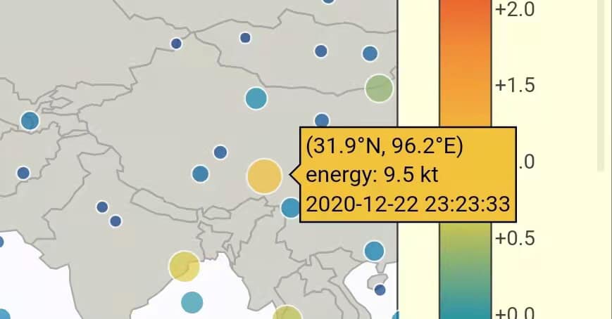 Kineski mrežni centar za potrese potvrdio je da je njihov seizmički sustav Qinghai zabilježio eksploziju u 23:25:44 blizu granice između županija Nangqian i Yushu.