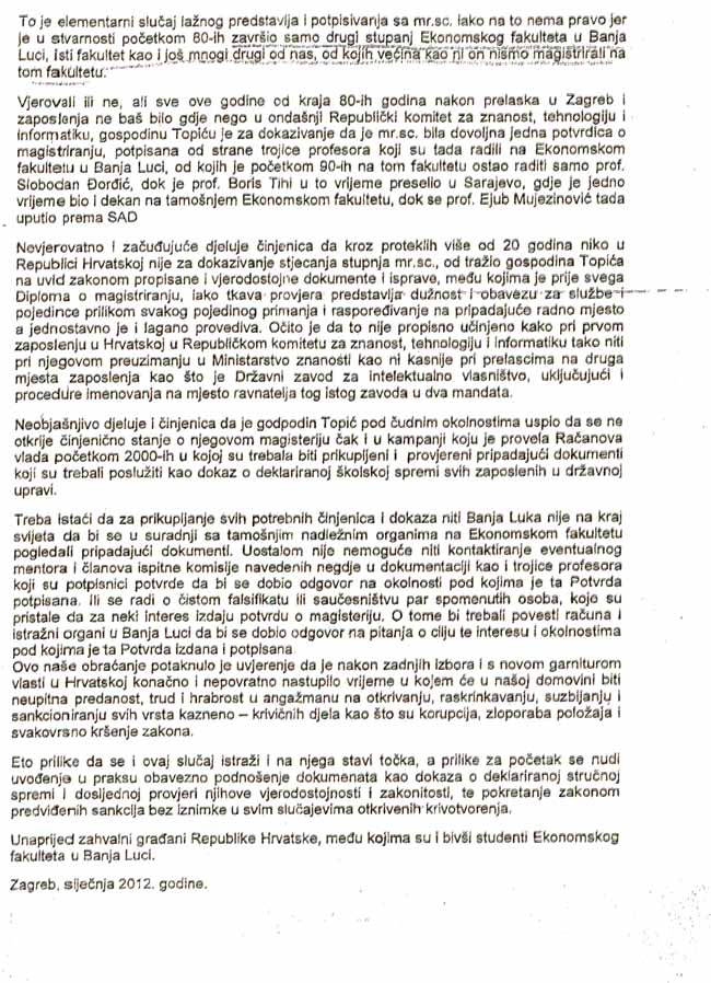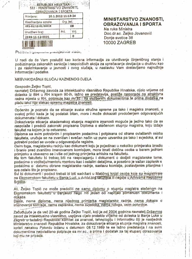 Podsjetimo, jedan od medijski najpoznatijih slučajeva u Hrvatskoj koji se odnosi na suspektno stjecanje diplome sa Sveučilišta u Banja Luci, a koji je do današnjih dana ostao nerasvjetljen, je slučaj bivšeg ravnatelja Državnog zavoda za intelektualno vlasništvo Republike Hrvatske (DZIV), uvaženog magistra Željka Topića. Nakon DZIV-a i međunarodne karijere pri EPO u Munchenu, gospodin Topić danas u Zagrebu vodi konzultantsku tvrku pod nazivom IP Topić gdje u uvodniku tvrtke na internetskim stranicama sam sebe naziva doajenom intelektualnog vlasništva u ovom dijelu Europe.