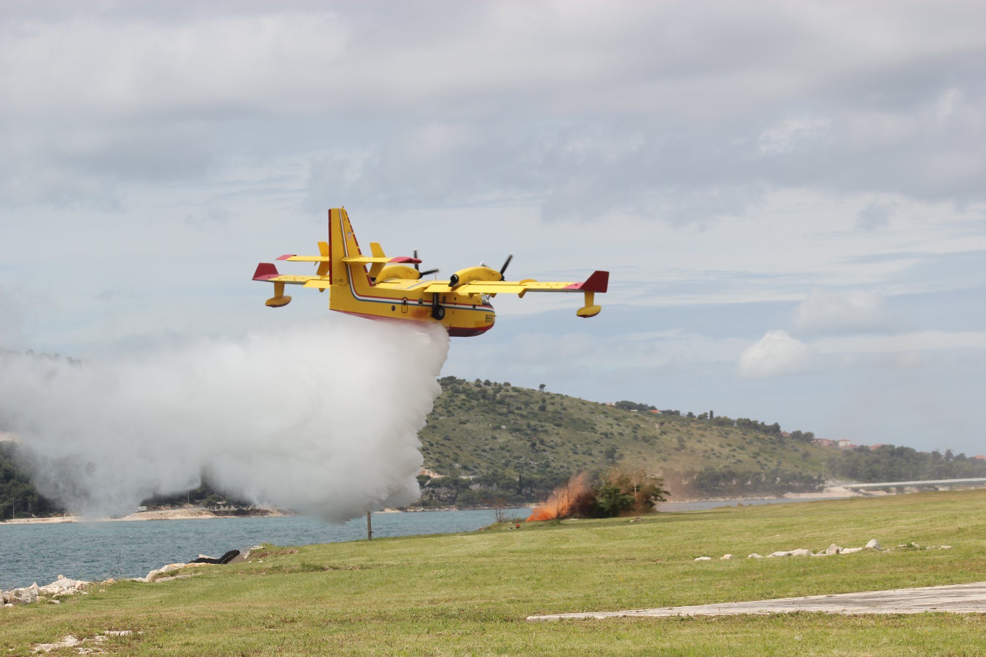 Nakon kratkog posjeta Situacijsko-operativnom središtu, u kojem su ukratko upoznati s radom službenika, dužnosnici su se uputili na prostor vojarne „Knez Trpimir“, gdje je uslijedila vatrogasna vježba u kojoj je prikazano postupanje prilikom požara otvorenog prostora. Uz vatrogasna vozila i vatrogasce, na vježbi su sudjelovali protupožarni zrakoplovi Canadair i Air Tractor te helikopteri. Prikazana je mogućnost korištenja vojnog desantnog broda za prijevoz vatrogasaca na požarište te desantiranje vatrogasaca iz helikoptera. Simulaciju izvlačenja ozlijeđenog vatrogasaca pomoću helikoptera izveli su pripadnici HS tima, sastavljeni od članova Državne intervencijske postrojbe i HGSS-a.