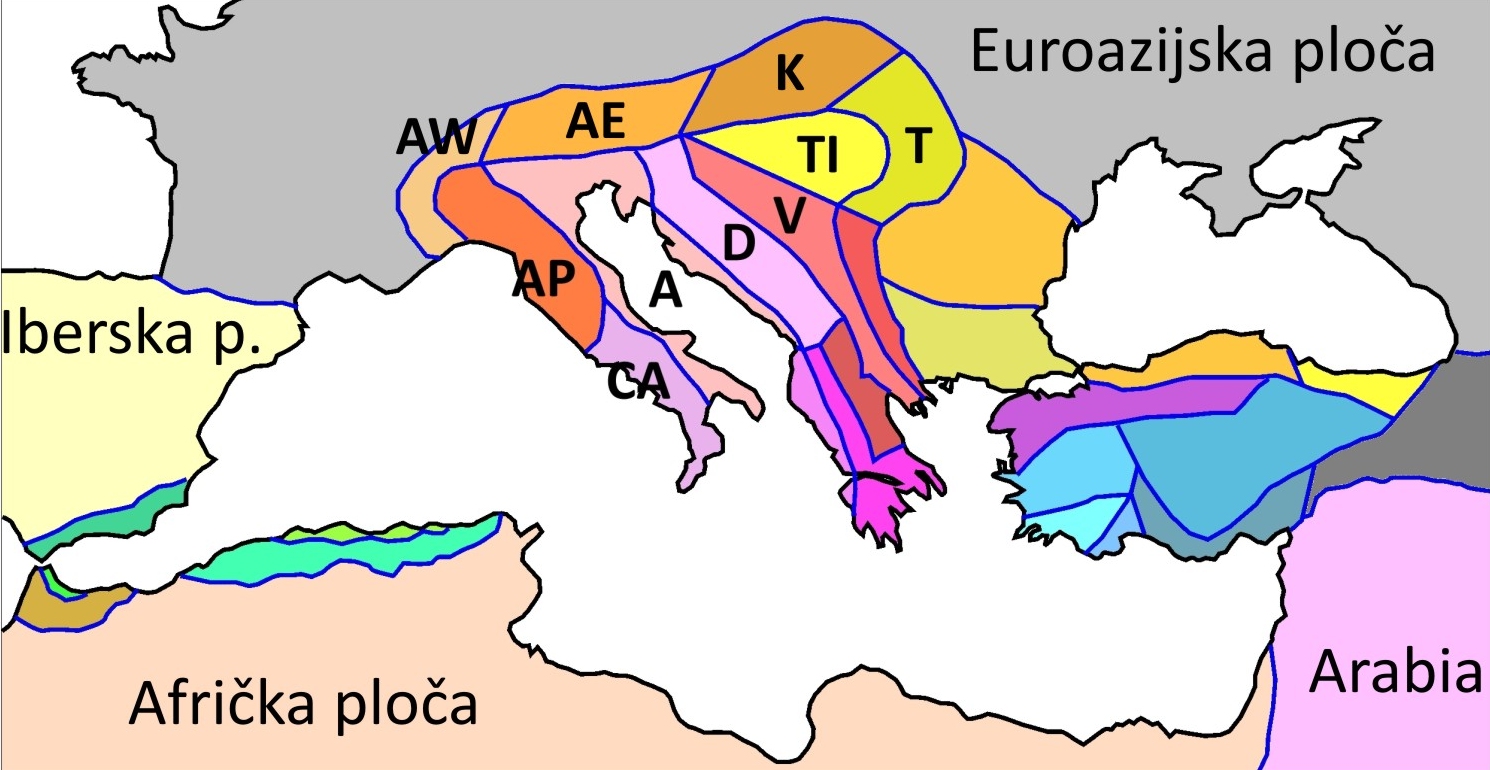 Slika 1) Ploče i mikroploče na području Sredozemlja. AW = Zapadna Alpe, AE = Istočne Alpe, K = Karpati, T = Transilvanija, AP = Apenini, CA = Kalabrija, A = Apulija, D = Dinaridi, V = Vardar, TI = Tisija
