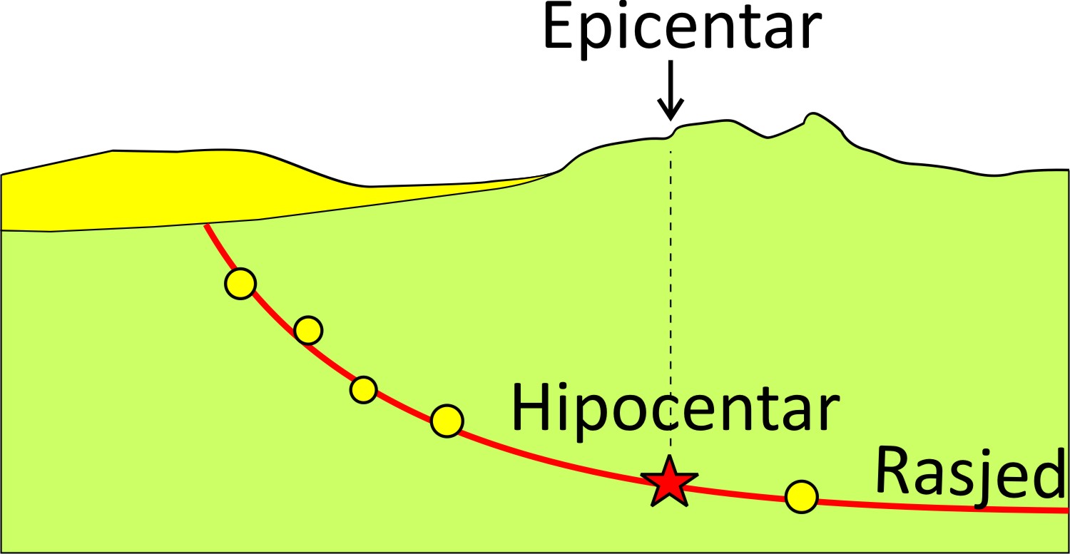 Mjesto u Zemljinoj dubini gdje su stijene puknule naziva se žarište ili hipocentar, a njegova vertikalna projekcija na površini je epicentar. Dakle, potres ne nastaje u epicentru, nego u hipocentru (žarištu). Rasjed na kojem je nastao neki potres gotovo nikad se na površini ne nalazi na mjestu epicentra, osim kod vertikalnih rasjeda kao što je San Andreas u Kaliforniji. U najvećem broju slučajeva, taj se rasjed uopće ne vidi na površini. Možemo samo pretpostavljati kojem bi površinskom rasjedu mogao odgovarati dubinski rasjed na kojem je nastao neki potres.
