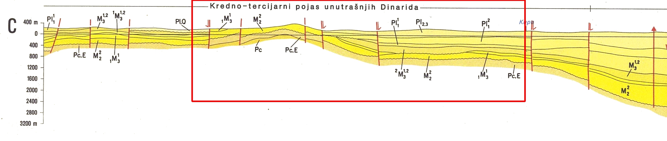 Slika 3) Jugozapadni dio geološkog profila po području zahvaćenom potresom. Epicentralno područje je označeno crvenim okvirom. Vidi se da geološke strukture nisu nacrtane, znači da nisu poznate na dubinama ispod 1200 m dubine. Izvor: Osnovna geološka karta SFRJ, List Sisak L 33-93, 1:100.000, Geološki zavod Zagreb, Savezni geološki zavod Beograd, 1987.