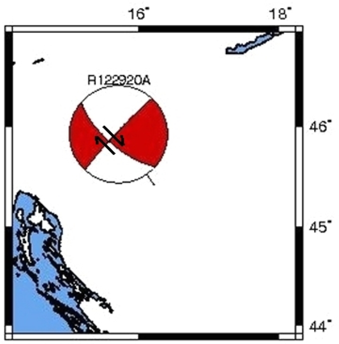 Slika 4) Mehanizam rasjeda koji je izazvao M 6.4 potres u Petrinji. Pomak duž rasjeda prikazuju polustrelice. Numeričko rješenje je napravio QRCMT INGV Bologna.
