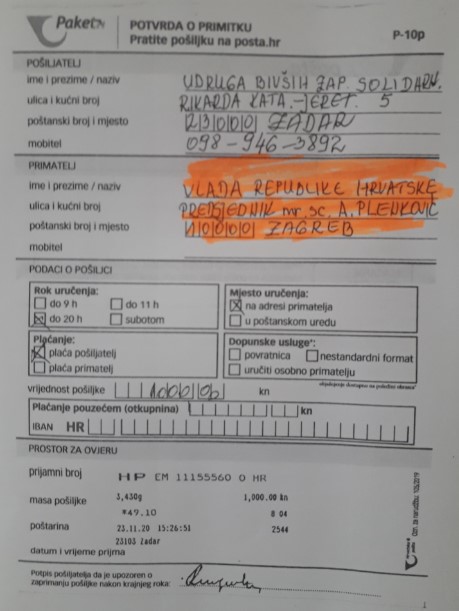 Poštovani predsjedniče Vlade Republike Hrvatske, dostavljamo Vam 551 potvrdu otplaćenih dionica bivših uništenih zadarskih poduzeća u pretvorbi i privatizaciji kao što su: Plodine, Bagat, Zadranka,Vinilplastika, Put, Tekstilni industrija Elegant, Jadran, Mesopromet, Jugoplastika-Diokom, G.P. Radnik, Gramat, Crvena Luka, Ilirija, Turisthotel, Trio-Obrovac, Zadar d.d., Agrooprema, Napredak, Bukovčanka, Tvornica Kruha Zadar, Tvornica konopa i veziva, Šavrić d.d., Mljekara, Marina Dalmacija, Maraska, Kanjon Zrmanja, Promet, Hoteli Zadar, Borik, Elektronika, Elektronika- Sklad, Transport Zadar, Gortan, Nauta Lamljani, Luka, EIG, IGM, Adria…, koji su Udruzi dostavili radnici i koji zahtjevaju da im Republika Hrvatska isplati otplaćene dionice. Vjerujemo predsjedniče da će Vlada RH iznaći rješenje da se isplate otplaćene dionice bivših radnika uništenih zadarskih poduzeća koji je prodavao FOND, a koji su ostali bez svojih radnih mjesta.