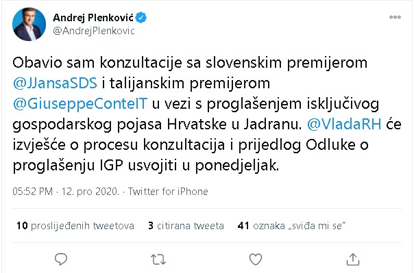 Premijer Republike Hrvatske, Andrej Plenković u subotu, 12. prosinca 2020. je najavio da će hrvatska vlada u ponedjeljak, 14. prosinca 2020. usvojiti izvješće o procesu konzultacija i prijedlog odluke o proglašenju isključivog gospodarskog pojasa (IGP) na Jadranu. Nastavak u vezi ove odluke očekuje se Saboru RH. Naime, saborski Klub zastupnika HDZ-a početkom mjeseca prosinca 2020. najavio je da će Sabor do kraja jesenjeg zasjedanja proglasiti isključivi gospodarski pojas (IGP) u Jadranskom moru.
