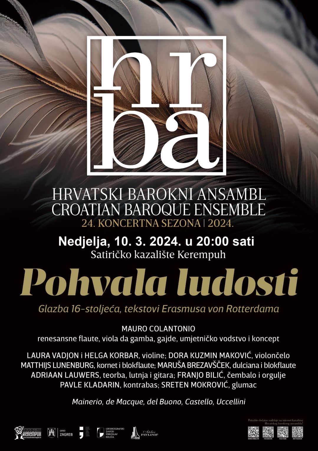 U nedjelju, 10. ožujka 2024. s početkom u 20 sati u Satiričkom kazalištu Kerempuh u Zagrebu Hrvatski barokni ansambl (HRBA) održava 3. koncert u svojoj 24. koncertnoj sezoni. Koncert s glazbom iz XVI stoljeća pod nazivom “Pohvala ludosti” sa svojom kratkom i snažnom raspravom posvećen je Thomasu Moreu (1509.) i predstavlja Erazmovo remek-djelo.