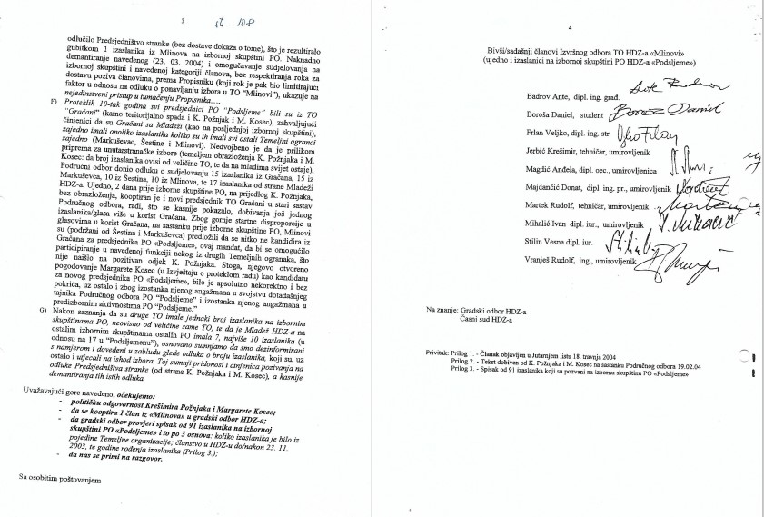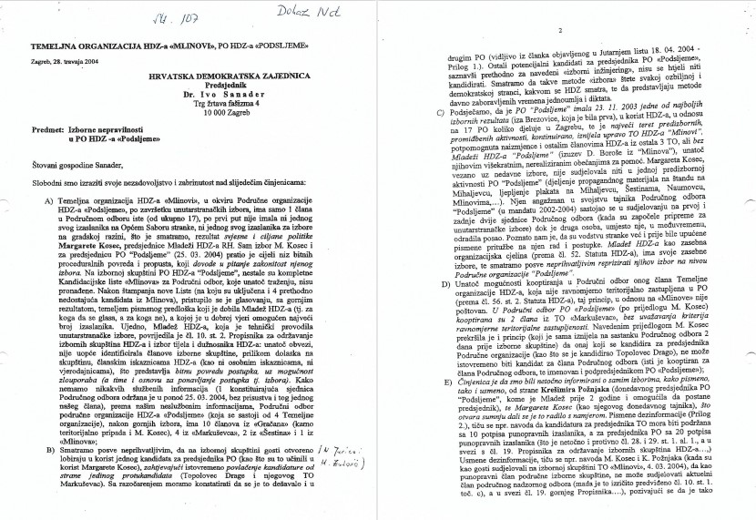 U prilogu dostavljam Vam dokument Temeljne organizacije HDZ-a Mlinovi, Predmet: Izborne nepravilnosti Područne organizacije HDZ-a “Podsljeme” upućene bivšem predsjedniku HDZ-a Ivi Sanaderu 28. 4. 2004., koji dokument je potpisalo 9 članova Izvršnog odbora HDZ-a “Mlinovi” uključujući i ja, u kojem se opisuju nezakonitosti koje je Margareta Mađerić, djevojački Kosec, kao predsjednica mladeži HDZ-a provodila prilikom izbora za predsjednicu Područne organizacije HDZ-a “Podsljeme”. Zatražili smo, uz ostalo, političku odgovornost za Margaretu Kosec, no u biti nije poduzeto ništa efikasno.