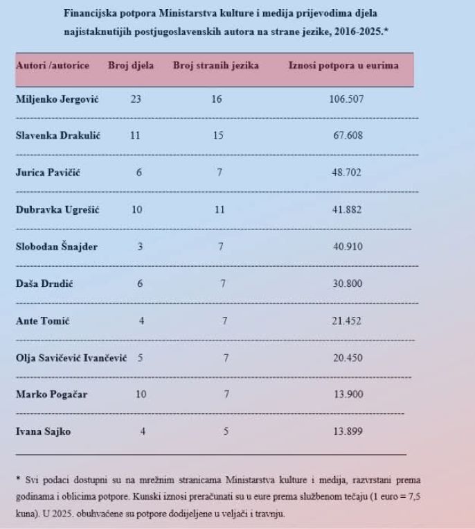 Na popisima dobitnika državnih potpora za prijevode na strane jezike nema djela Krleže, Marinkovića, Kamova, Kranjčevića, Đalskoga, Ujevića, Brlić Mažuranić, Šoljana, Šimića, Novaka, Fabrija, Slamniga, Kušana, Dragojevića, Gudelja i drugih klasika hrvatske književnosti ili su zastupljena gotovo simbolično. U veljači i travnju 2025. Ministarstvo je dodijelilo po tisuću eura za prijevode djela Ujevića, Nazora, Vojnovića na engleski i Đalskoga na albanski jezik. Tisuću eura dodijeljeno je i za prijevod dječjega klasika Čudnovate zgode šegrta Hlapića na albanski. To je ukupno 5.000 eura za pet pisaca i pet knjiga – točno onoliko koliko je dodijeljeno prijevodima dviju Jergovićevih knjiga na makedonski i ukrajinski, te manje od 8.612 eura namijenjenih prijevodima dviju knjiga Jurice Pavičića na makedonski i engleski. Ti pisci nisu živi, nemaju literarne agente i svoje prevoditelje, ne galame u medijima, nisu interesno umreženi, ne pripadaju ideološkim i kulturnim sektama koje imaju svoje predstavnike u državnim i gradskim povjerenstvima koja odlučuju o potporama.[8]