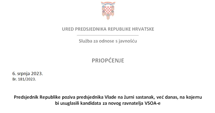 Kao što Vam je poznato, 10. srpnja 2023. godine istječe mandat ravnatelja u ostavci Vojne sigurnosno-obavještajne agencije generala Ivice Kindera. Budući da nas dvojica još uvijek nismo dogovorili i usuglasili kandidata za novog ravnatelja VSOA-e, pozivam Vas da se žurno sastanemo, razgovaramo i usuglasimo kandidata za ravnatelja VSOA-e, kao što je to propisano Ustavom i zakonom te u skladu s ustaljenom praksom kod svih dosadašnjih imenovanja čelnika sigurnosno-obavještajnih agencija.